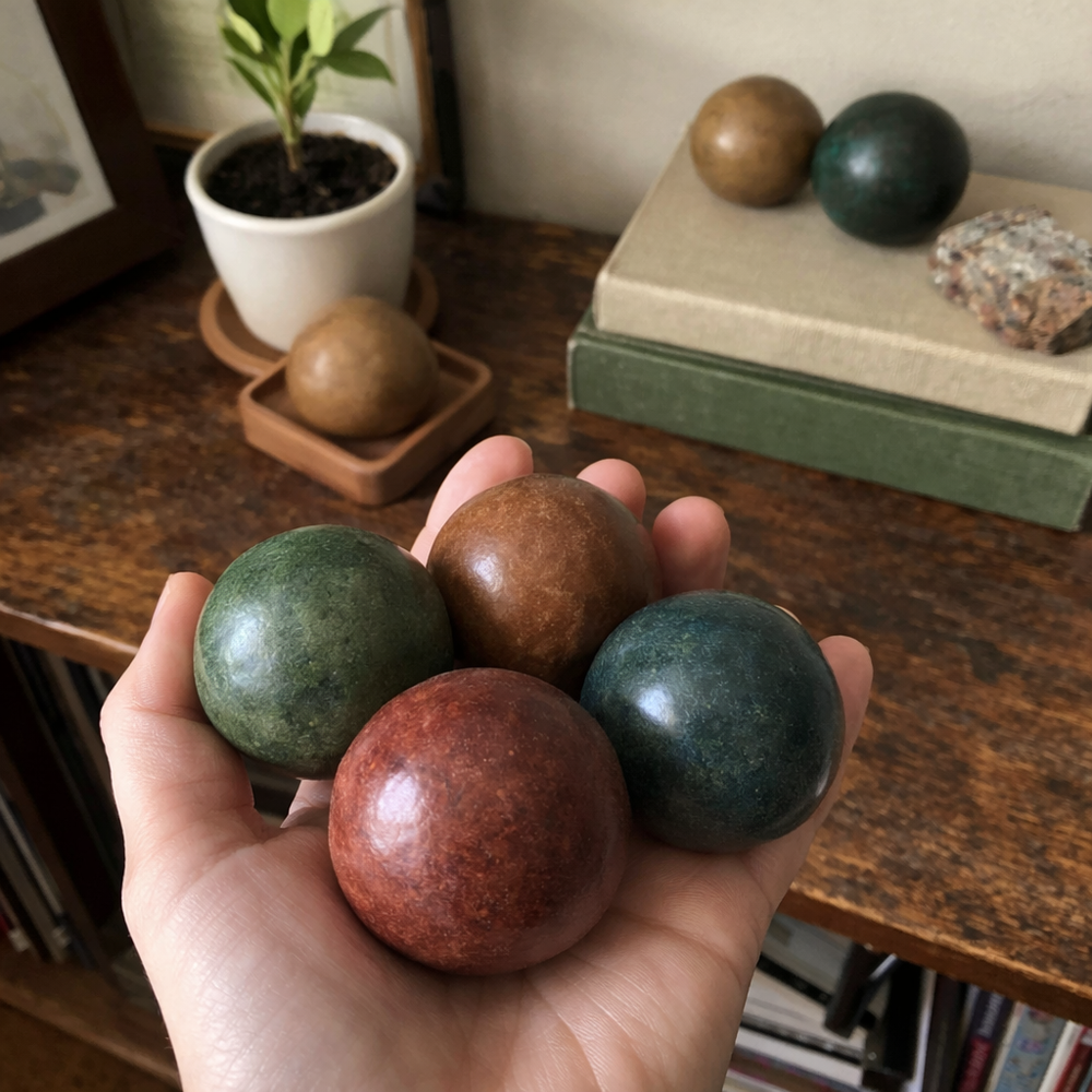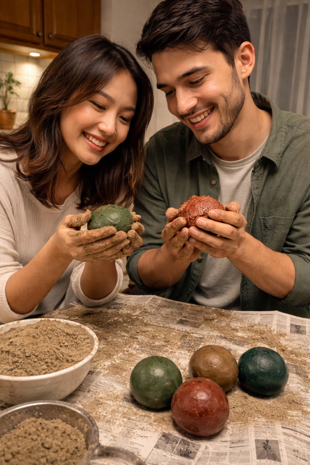 A Dorodango is a polished sphere made from earth and water. The process is slow and hands-on, focusing on shaping, drying, and polishing until the surface becomes smooth and reflective.